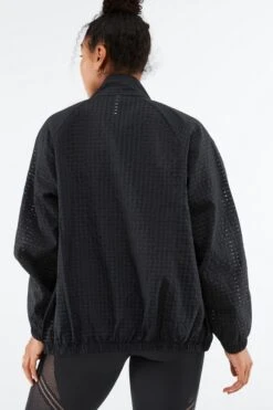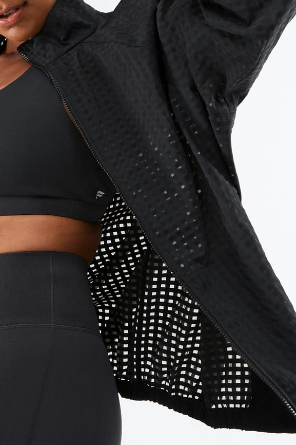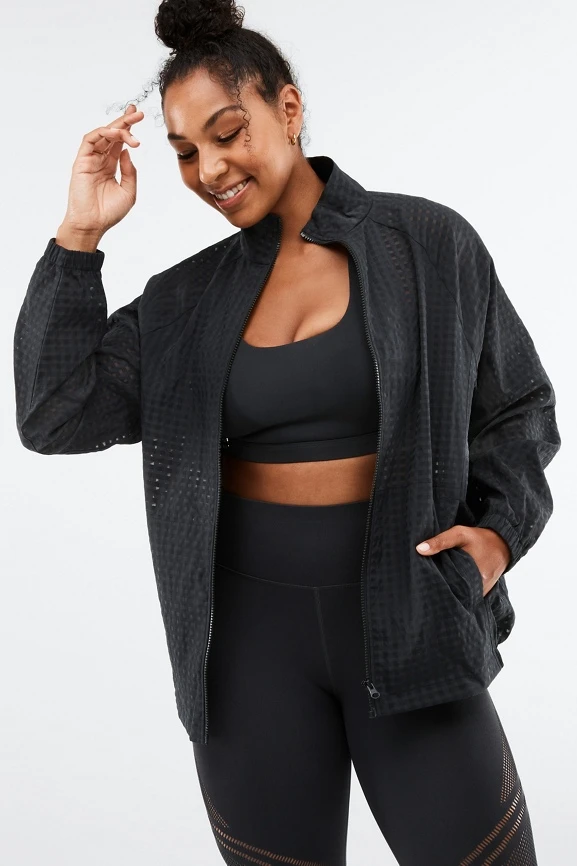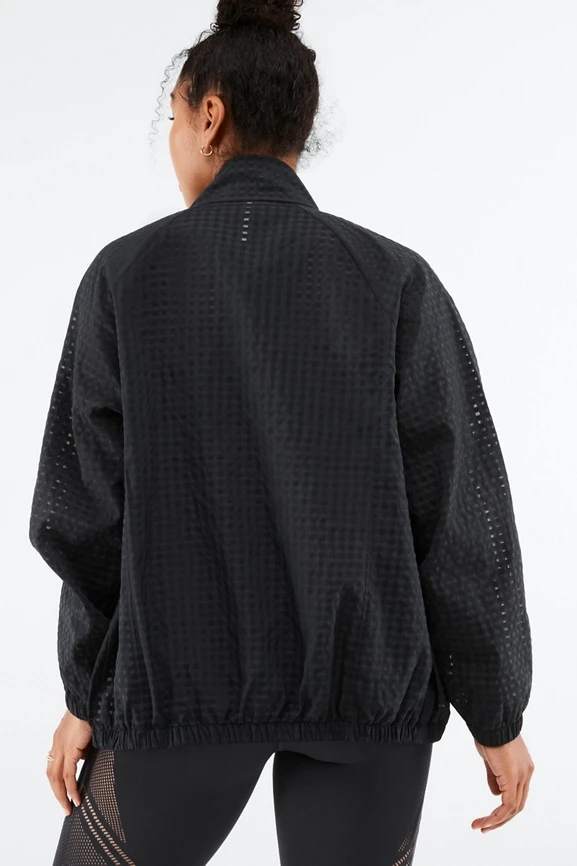 For those in-between-seasons months, throw on this lightweight design featuring a zip-up, mock-neck silhouette, and elastic cuffs.