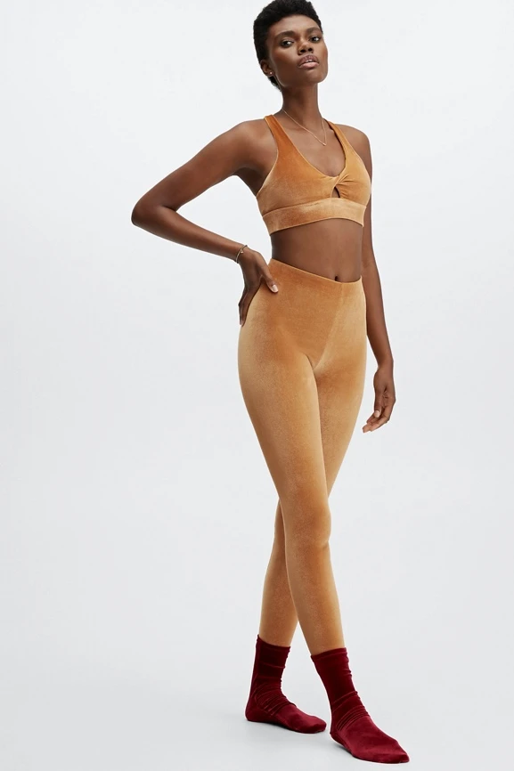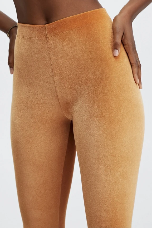 These plush, velour fabric leggings have a classic, high-waisted silhouette for an elevated take on a yoga staple.