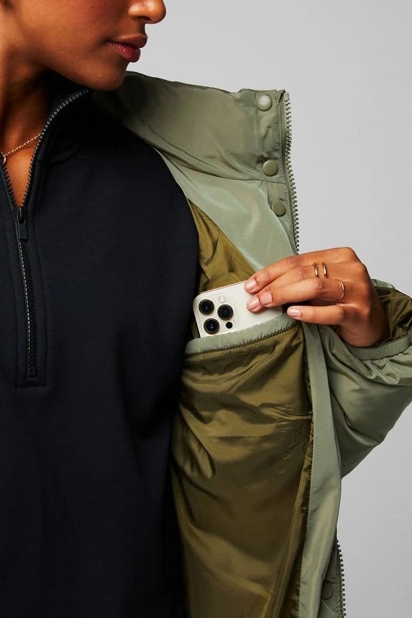 Layer up. This puffer offers a longer, calf-length silhouette to keep you warm all season. You’ll love the chic waist cinch detail, side and interior pockets, and adjustable hood for added coziness.
