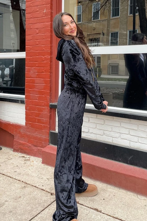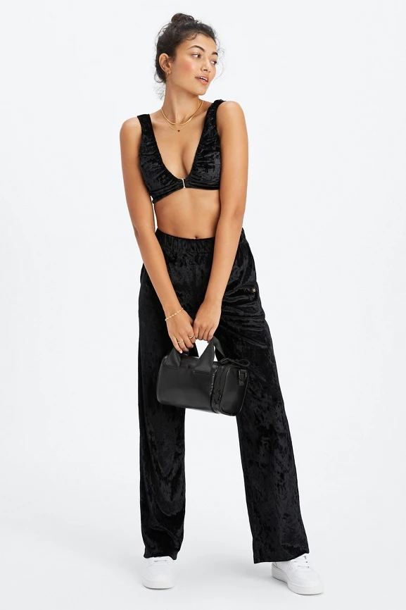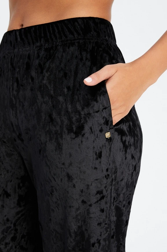 This high-waisted style in plush, velour fabric has flattering wide legs and a comfortable elastic waistband.