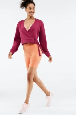 Perfect to layer over your yoga gear or dress up with denim, our crossover wrap top in dual-coloured terry features a fitted, flattering hem.