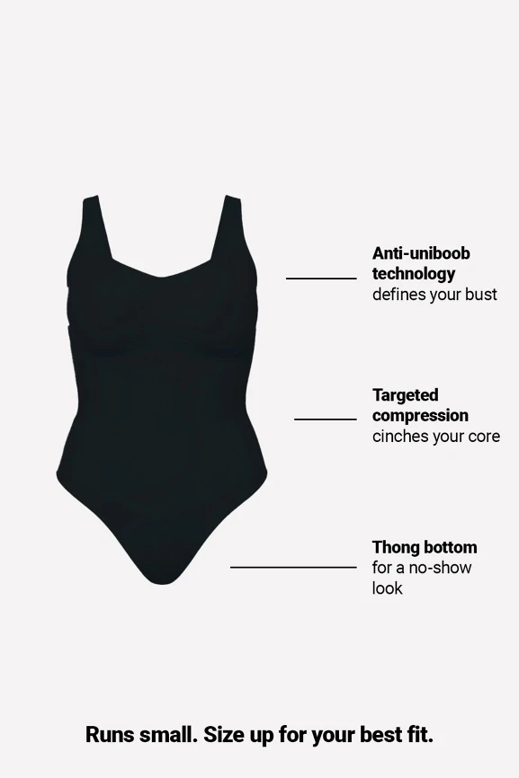 Our bestselling shapewear. With all-around compression that shapes and firms your curves, our Shaping Thong Bodysuit is cut from seamless, breathable, 4-way stretch fabric for all-day comfort. Anti-uniboob technology supports and defines the tiddies.