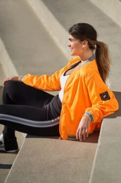 The bomber is back. Satin Stretch fabric gives this classic outdoor style a chic, feminine twist. Pair it with leather trousers and heels for a cool girl look, or keep it casual over your fave leggings.