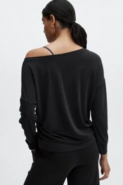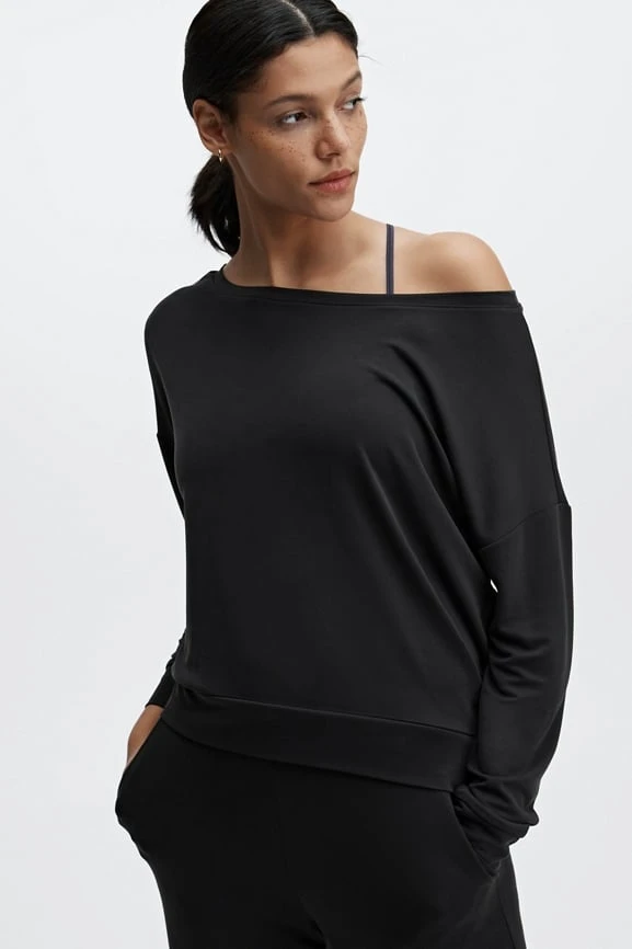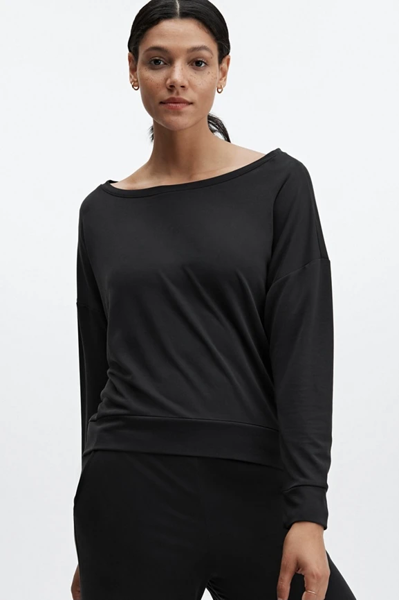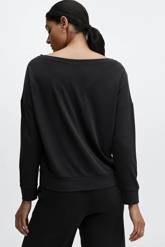 If you’re looking for the perfect layer for pre-and-post workouts, look no further. This pretty pullover will do the trick with its soft terry fabric, relaxed silhouette and stylish boatneck design.