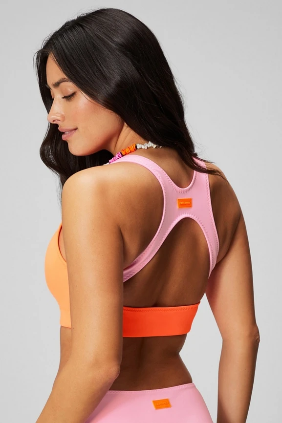 Swimming in support. Consider this swim tank the sports bra of swimwear. With compression mesh and a sleek racerback design, you won’t be afraid to jump in head first.