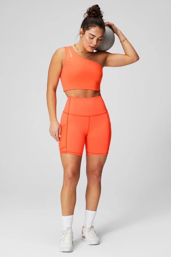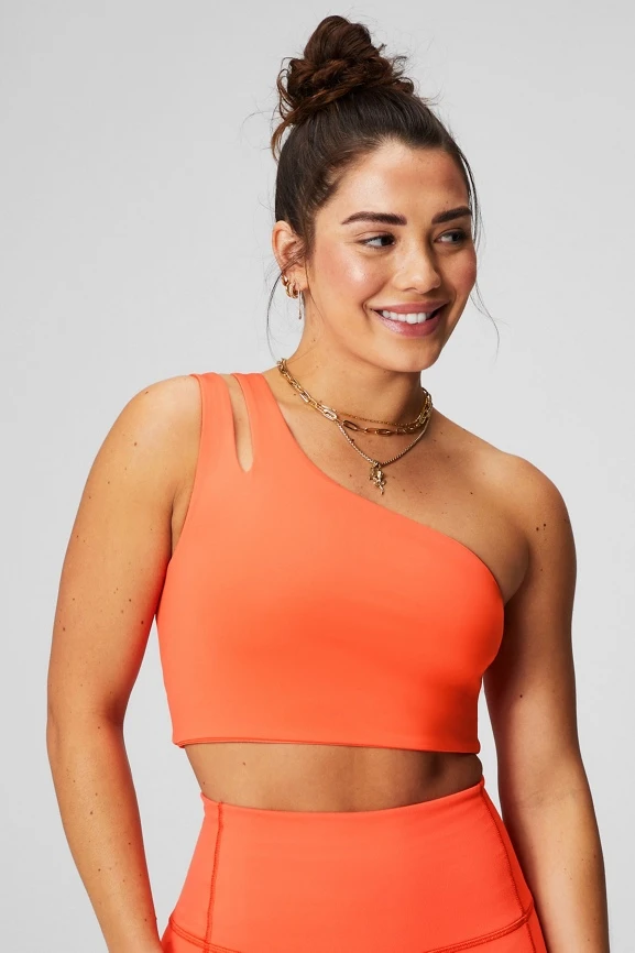 Make a style statement. This midi bra features double straps and an asymmetrical neckline. It’s designed for performance but chic enough to wear out and about.